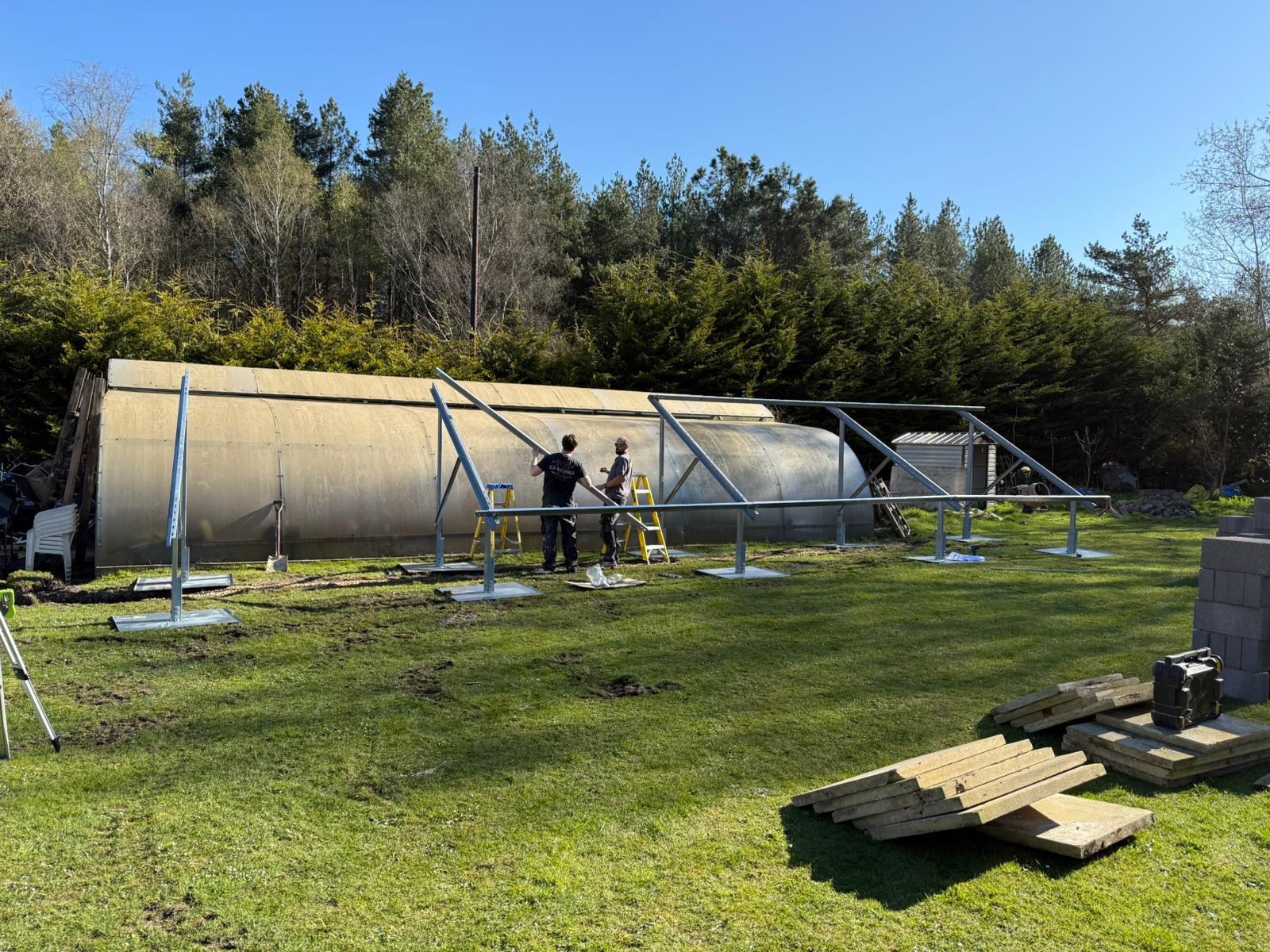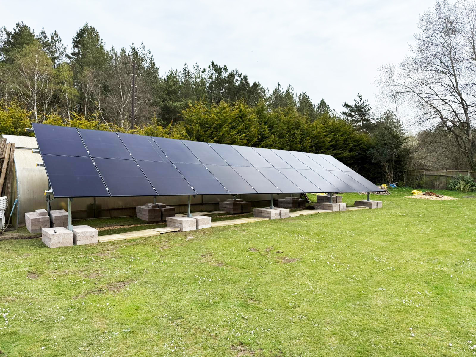 The mount location was chosen to help hide an existing agricultural building from view, with the panels orientated dead south to maximise sun exposure. The 3 x batteries and inverter were placed inside a garage.